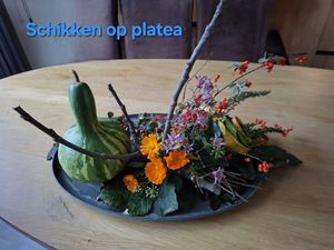 De materialen zijn aanwezig, je neemt zelf een geschikte vaas, schaal of een andere ondergrond mee, tenzij dit anders wordt aangegeven. Je hebt daarvoor vast meer in huis dan je denkt en om ons milieu minder te belasten is een kringloop ook een goede mogelijkheid om gebruik van te maken. Je krijgt vooraf bericht wat je gaat maken met een voorbeeldfoto en kunt dan zelf zien wat voor soort ondergrond eronder kan of mag. Zo krijg je met hetzelfde materiaal uiteindelijk heel verschillende stukken en dat geeft de leukste resultaten. We gebruiken altijd dagverse materialen, daarnaast proberen we zoveel mogelijk biologische materialen te bemachtigen uit pluktuinen enz. De organisatie is in handen van Groei & Bloei afdeling Ommen.